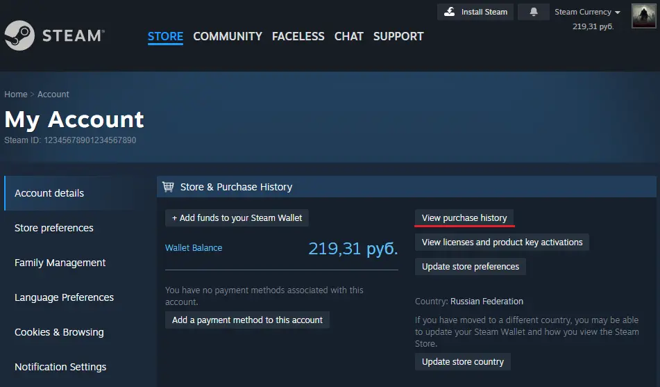 Заходим в раздел "Об аккаунте" (Account details), далее "История покупок" (View purchase history).