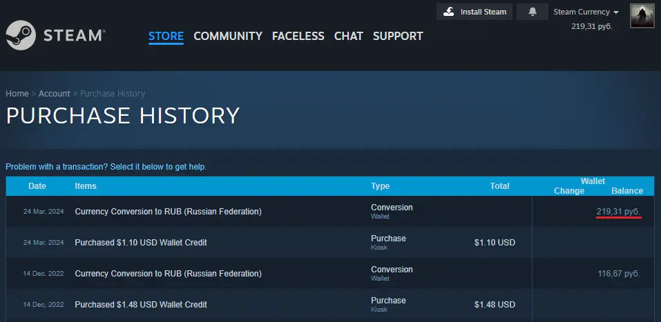 Далее пополняете счет вашего аккаунта любым удобным способом. Для примера, я пополню счет на 100р. После зачисления средств (Следует понимать, что все зачисления на аккаунт производятся в долларах), история покупок выглядит следующим образом: